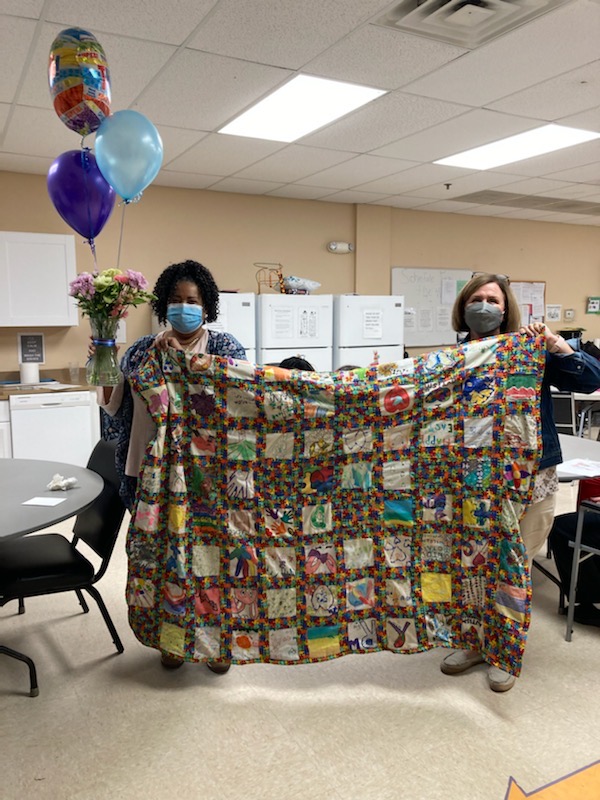 Earlier this year, the concept creating a quilt was suggested to the team by the Chimes Delaware Nursing Department. Mary was thrilled with the idea and the team set to work cutting up patches and allowing program participants to contribute to the project and express themselves by drawing and painting on their squares. Mary worked with some of the program participants to stitch the squares together and Mary handled sewing the difficult seams and backing of the quilt to finish the project.